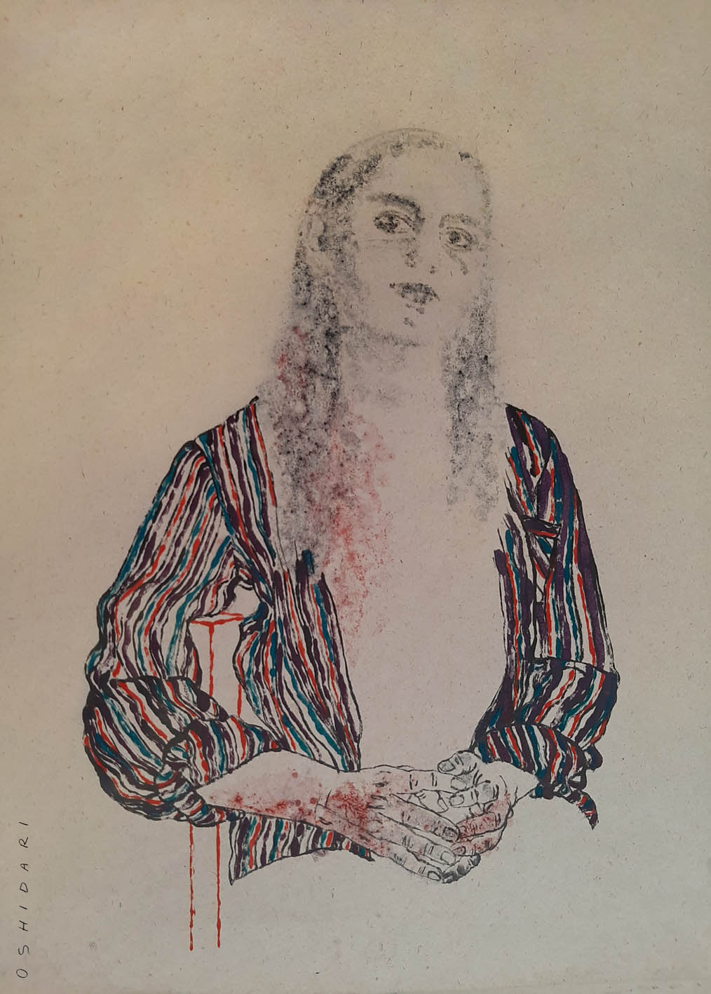 Pooneh Oshidari , Self portrait, 2019, ink and oil on paper, 50 x 35 cm