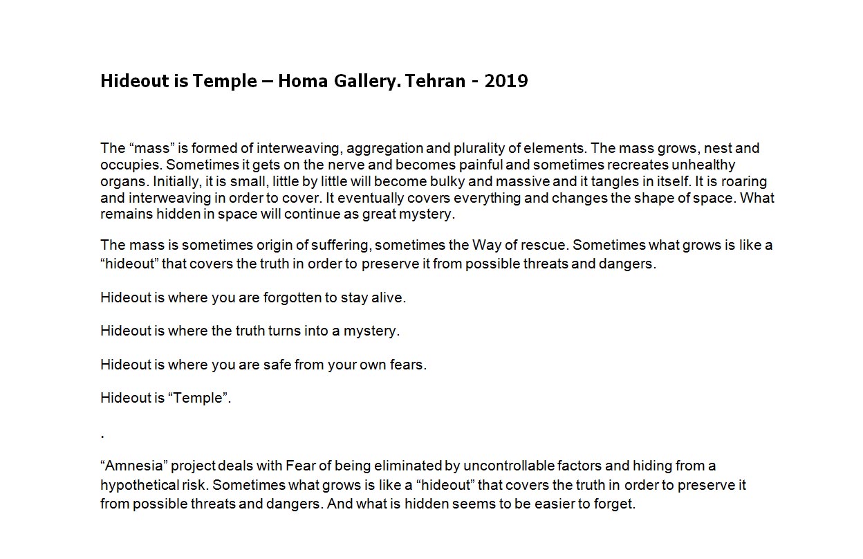 Pooneh Oshidari , “Hideout is Temple” project deals with Fear of being eliminated by uncontrollable factors and hiding from a hypothetical risk. Sometimes what grows is like a “hideout” that covers the truth in order to preserve it from possible threats and dangers. And what is hidden seems to be easier to forget.