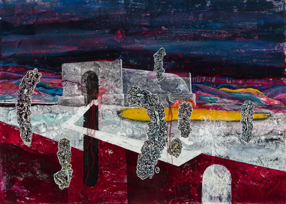 Pooneh Oshidari , Home-Land series, The island with an empty heart, Qeshm, 2020. Relief ink, oil and fabric on oil-painting paper. 72 x 100 cm