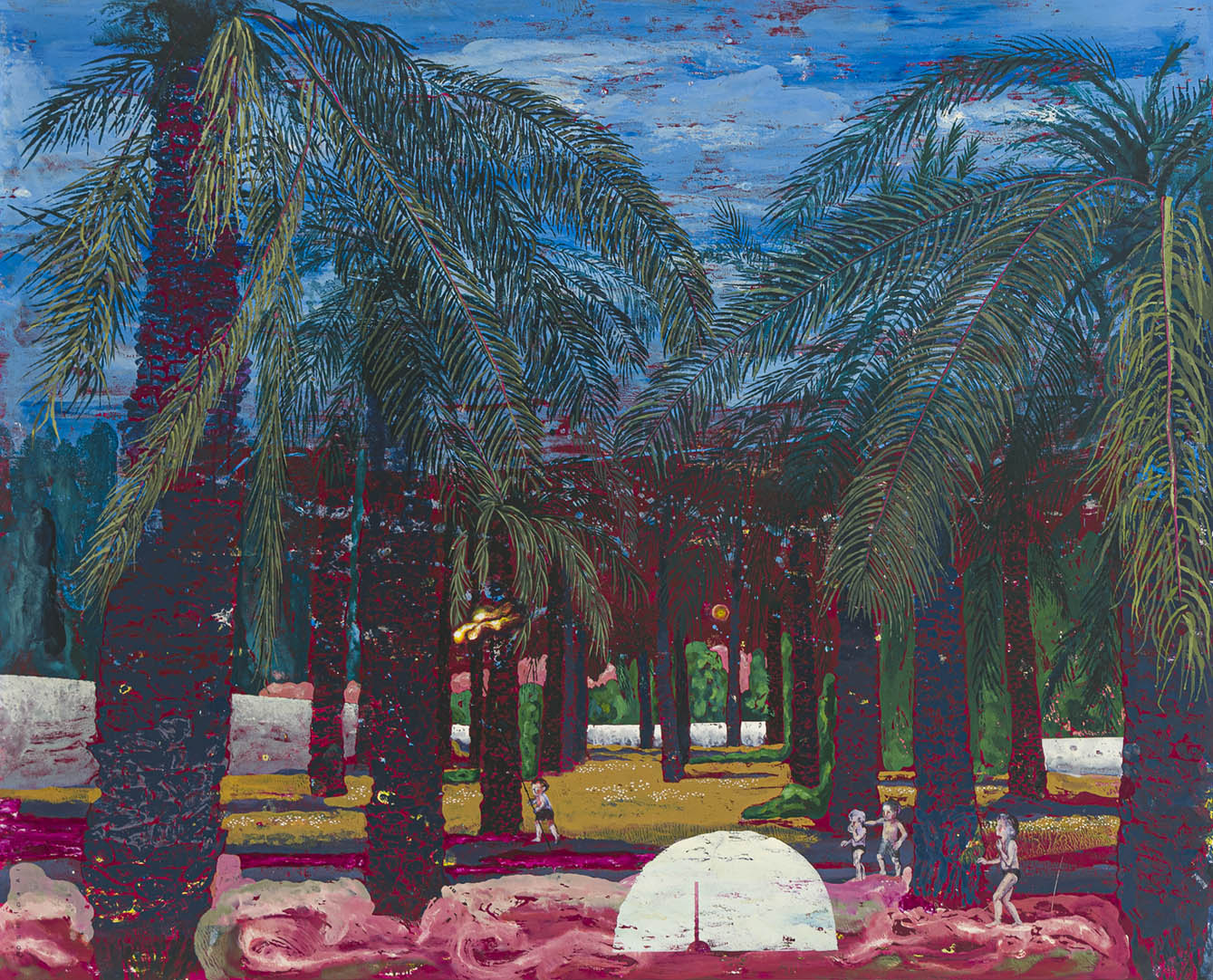 Pooneh Oshidari , The Palm garden, 2021, relief ink and oil on prepared canson figueras paper,, 104.5x130cm