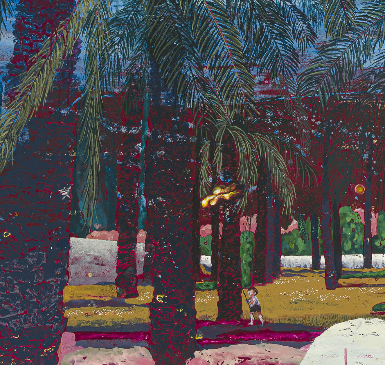 Pooneh Oshidari , Detail of painting, The Palm garden, 2021, relief ink and oil on prepared canson figueras paper, 104.5x130cm
