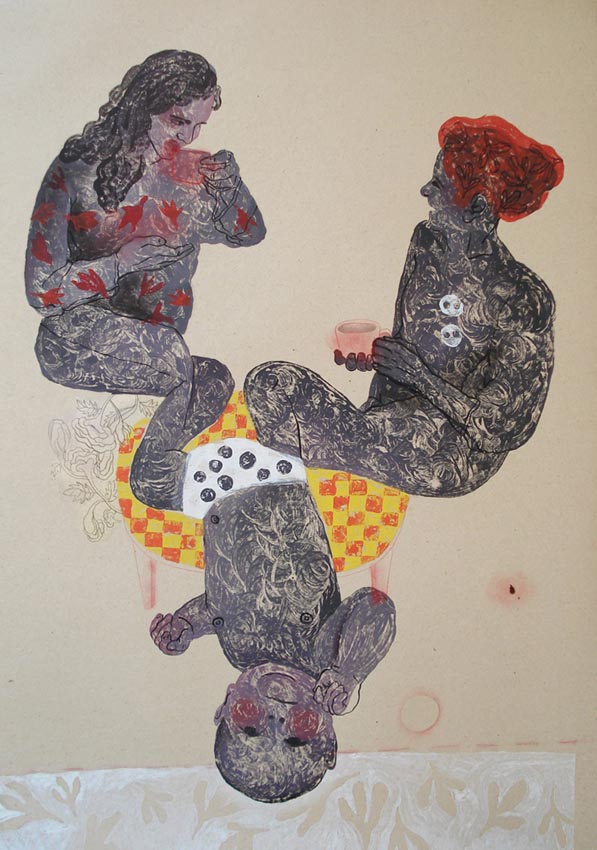 Pooneh Oshidari , Breakfast , 2011, mixed media on cardboard, 100x75cm
