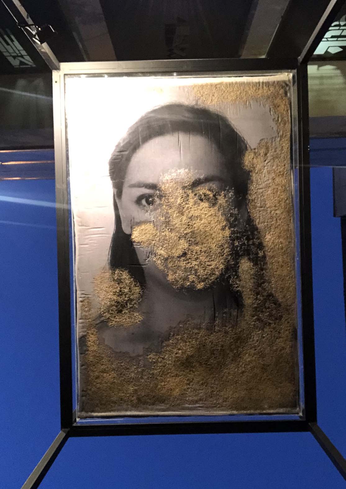 Pooneh Oshidari , Hideout, Part of installation after 10 days. metal structure, mirror, Plexiglas, cloth, plant seeds, 200 x 122 x 350 cm. growing roots on the self-portrait image.