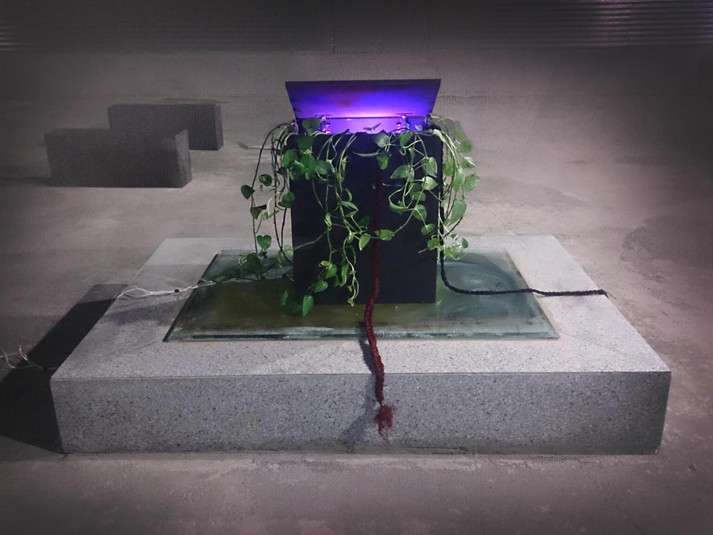 Pooneh Oshidari , Temple, 2016, mixed media, color projectors and alive Pothos, 180 x 100 x 80 cm, Light: Foad Alijani