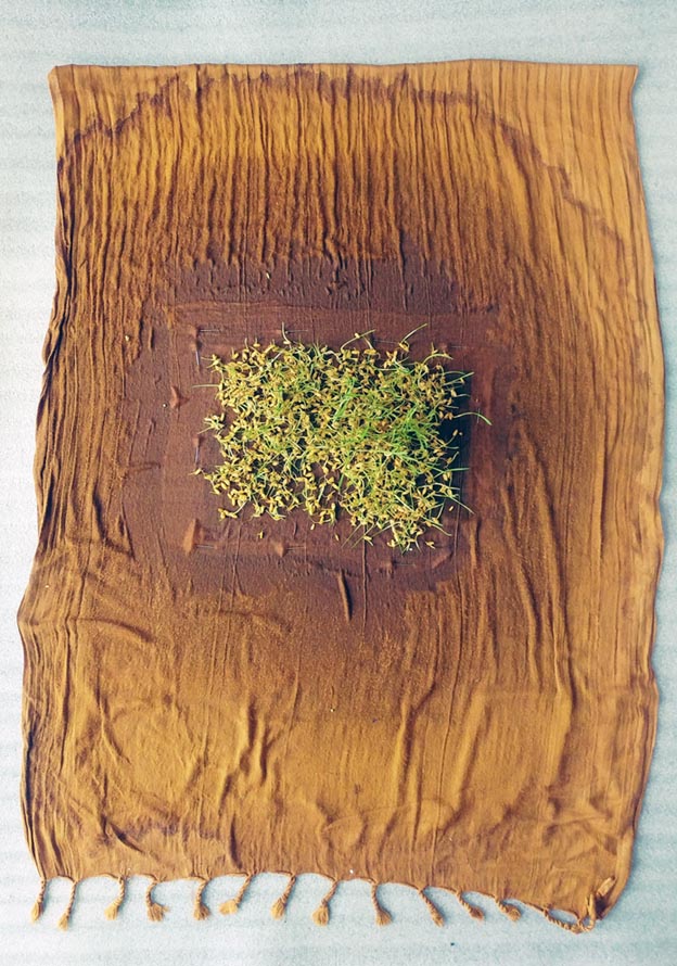 Pooneh Oshidari , Growing wheat on Nasim's scarf. The image of her previous home in Tehran is attached to the other side of the scarf. Nasim moved to Paris at 1995.