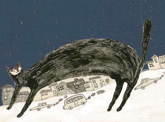 Pooneh Oshidari , Meeting_on_the_roof,_The_Last_Black_Cat,_2008,_mixed_media_on_cardboard,_18x30cm_2