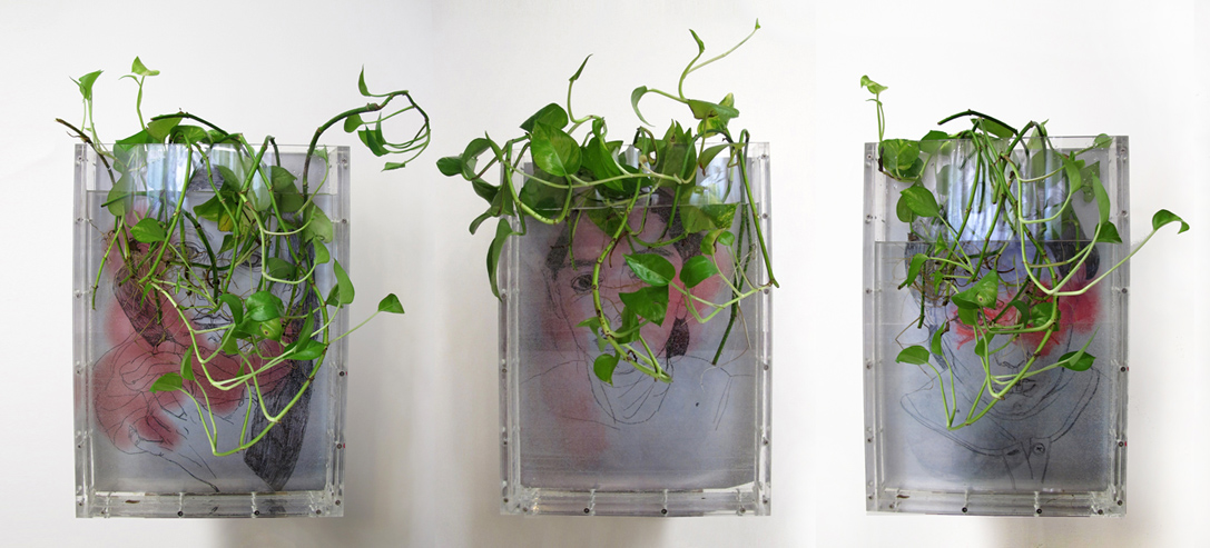 Pooneh Oshidari , Amnesia (painless series) work sample/ 2016 (Plexiglas, mono print on cardboard, climbing indoor plants/ each box dimensions 70 x 50 x 6 cm)