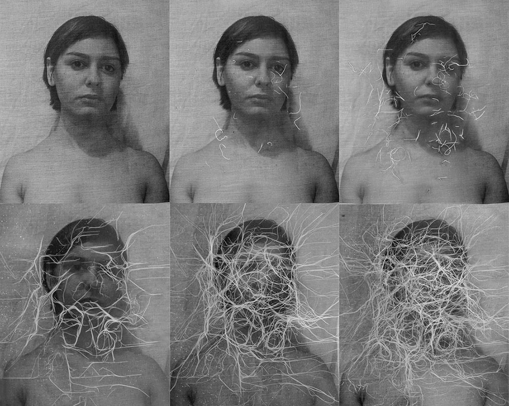Pooneh Oshidari , Process of the work during one month, Self portrait, 2016, grown roots on fabric, 35 x 30 cm