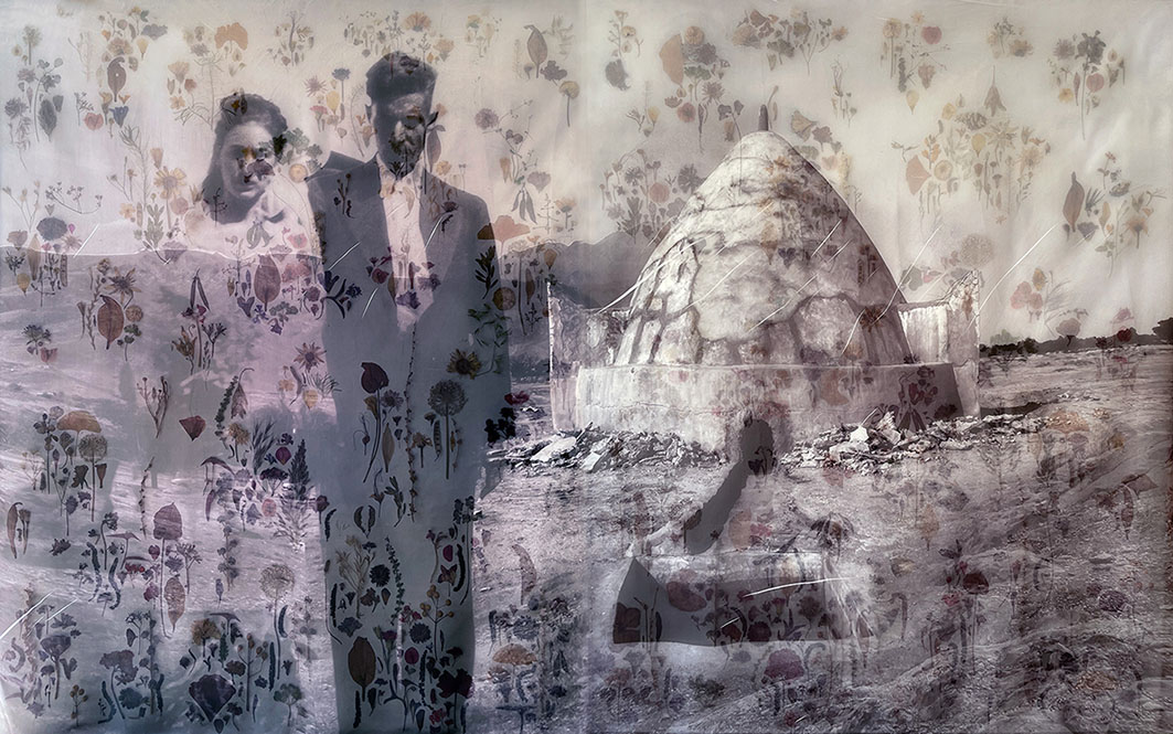 Pooneh Oshidari , Bahman and Shirin, 2021, 150 x 250 x 7 cm, dried flowers and fabric on canvas, Bavan gallery, Tehran
