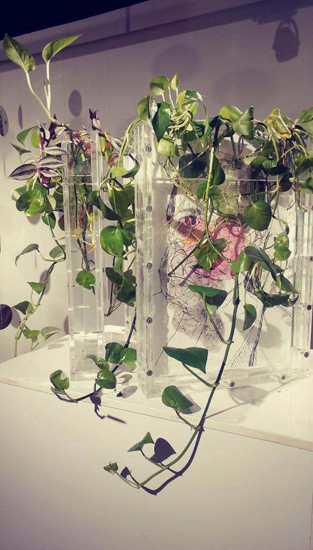 Pooneh Oshidari , Amnesia (painless series) 2018 (Plexiglas, mono print on cardboard, climbing indoor plants/ each box dimensions 70 x 50 x 6 cm)