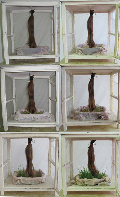 Pooneh Oshidari , Process of The Care project- Artist's hair, wheat, cheese box, 60x45x40 cm, France