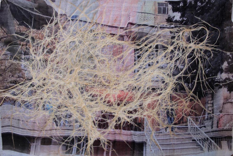 Pooneh Oshidari , Wheat roots through Tirdad's pullover and her previous home image in Tehran. Her previous Home image is attached to her red pullover. It is about 4 years that she is living in Paris.