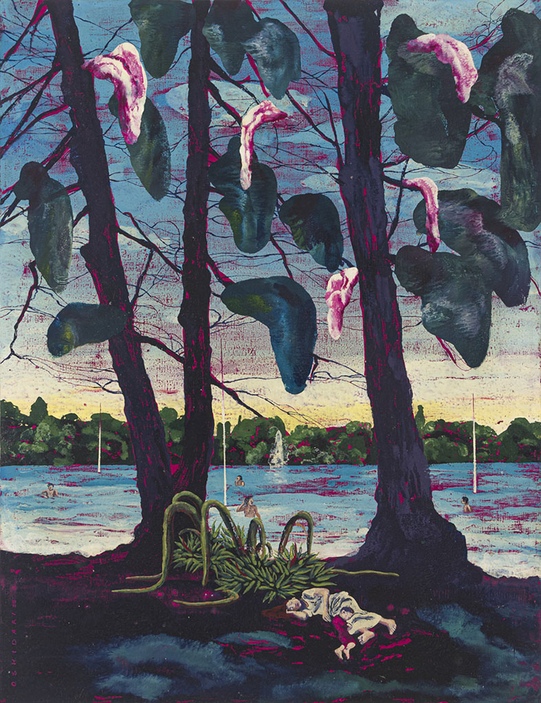 Pooneh Oshidari , Summer and lake, 2022, relief ink and oil on prepared canson figueras paper, 65x50 cm