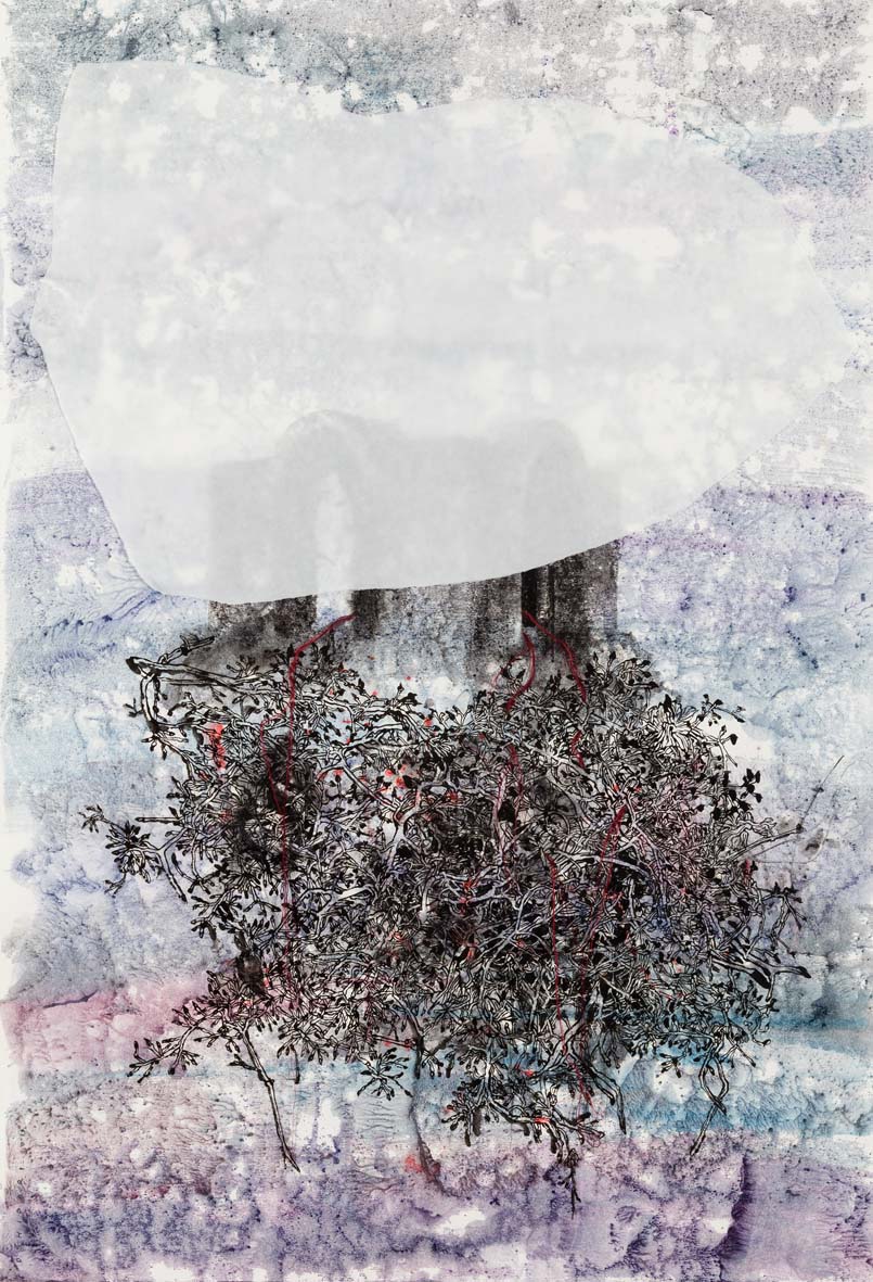 Pooneh Oshidari , Home-Land series, Khorramdasht, 2020. ink, and fabric on paper. 100 x 69 cm