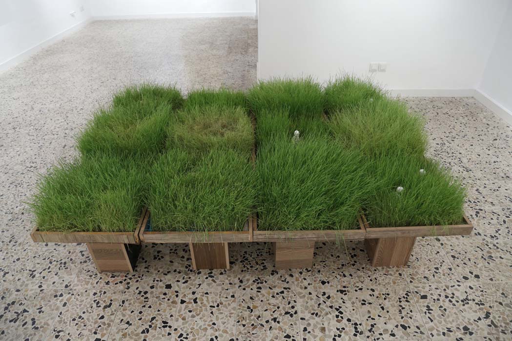 Pooneh Oshidari , besieged,2016,1month old, 250x180x70cm/Empty spaces in wheat boxes have been predefined to layout small mannequins.The farm has been begun to growth while it is being taken care and fed.