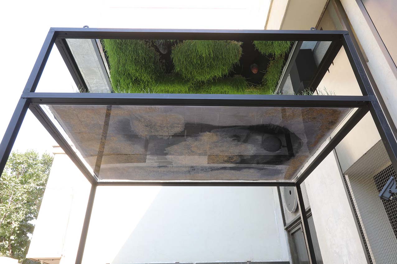 Pooneh Oshidari , Hideout, 2019, Part of installation. metal structure, mirror, Plexiglas, cloth, plant seeds, 200 x 122x 350 cm. The garden on the top and the portrait with roots on the other side.