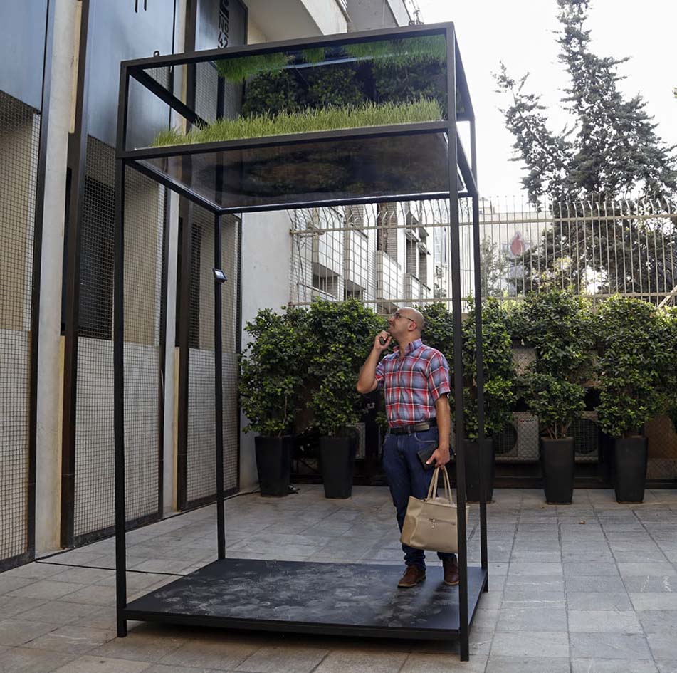 Pooneh Oshidari , Hideout. Tehran. Mohsen Gallery. Part of installation. metal structure, mirror, Plexiglas, cloth, plant seeds, 200 x 122x 350 cm. Some seeds were grown on a cloth based printed self-portrait. During 1 month, seeds grew and their roots gradually came through the image and covered parts of it. There is a mirror as a roof to show some parts of the small garden.