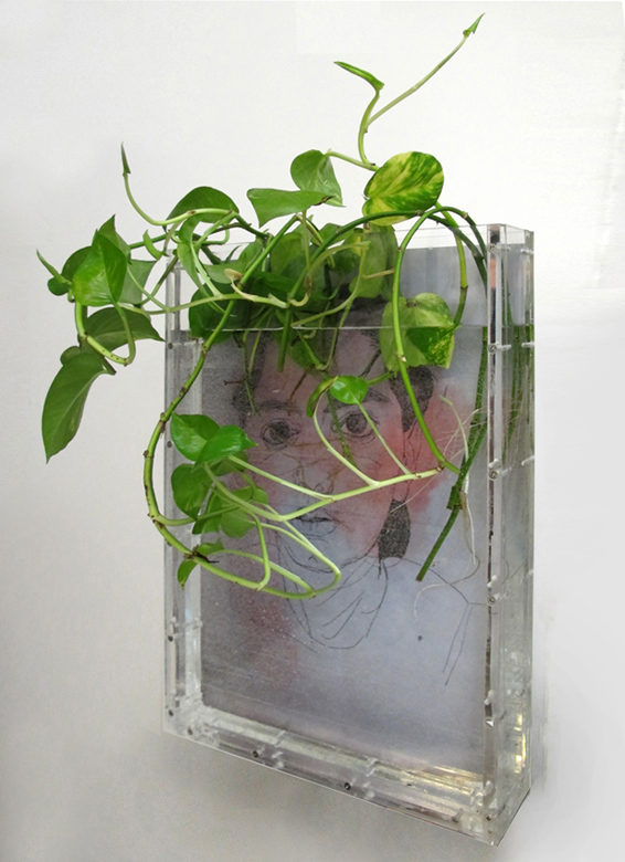 Pooneh Oshidari , Amnesia (painless series) work sample/ 2016 (Plexiglas, mono print on cardboard, climbing indoor plants/ each box dimensions 70 x 50 x 6 cm)