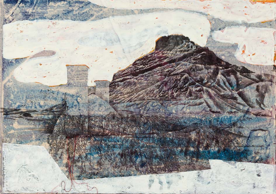 Pooneh Oshidari , Home-Land series, The silent tower, Relief ink, pencil and fabric on oil-painting paper. 70 x 100 cm