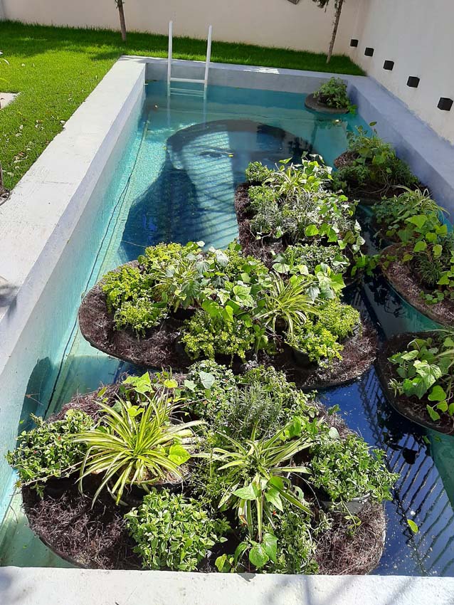 Pooneh Oshidari , Hideout 2 - Tehran. 2020. Bavan Gallery. 300 x 700 x 150 cm. This time-based project relies on one of the threats to the Anzali Lagoon’s biome, an invasive plant called Azolla. In this work, the image (artist’s self-portrait) at the floor of a clear pond gets gradually masked and concealed over several weeks by the rapid growth of the growing plants that covers the water surface and green algae and microorganisms floating in the water.